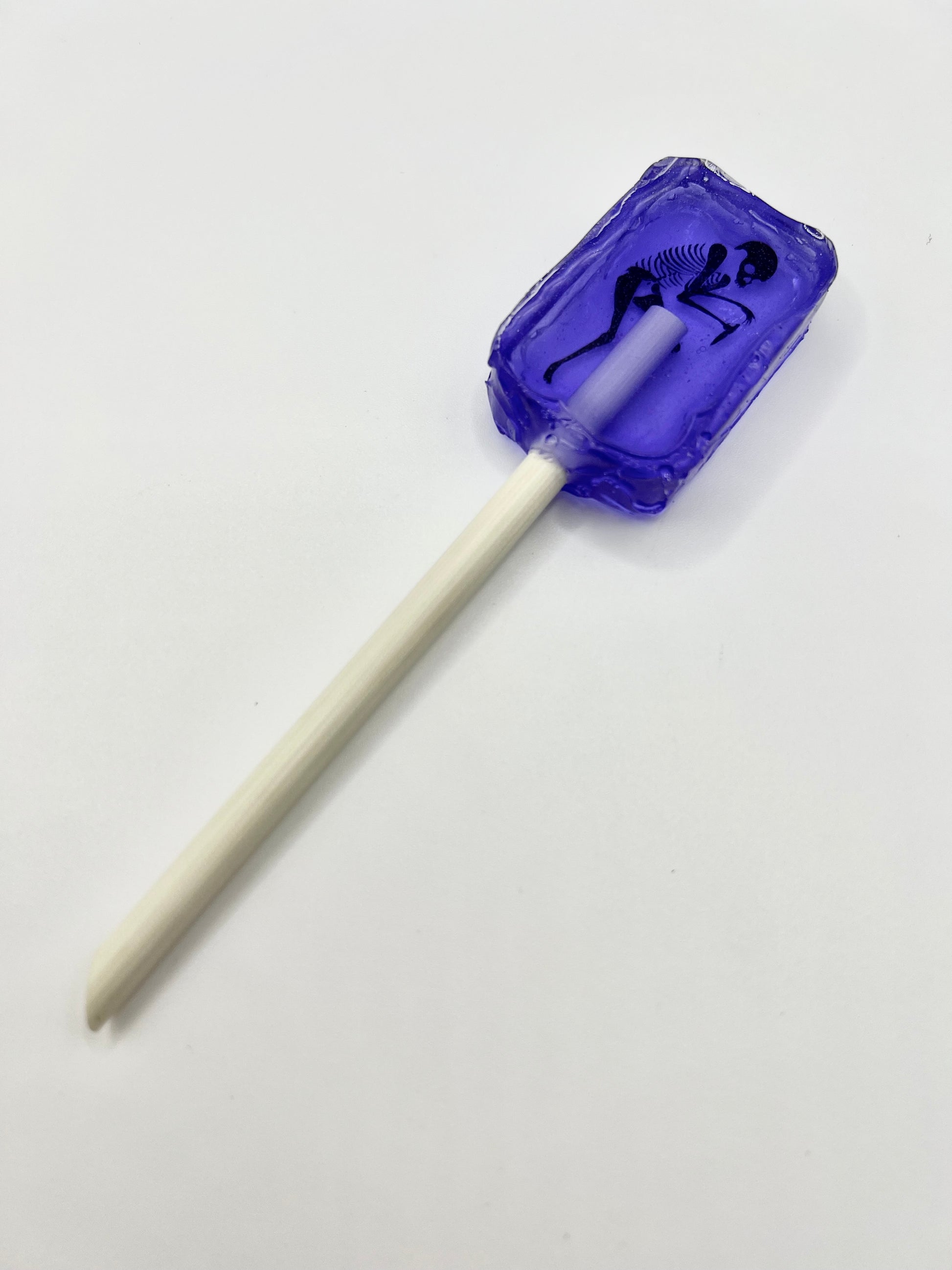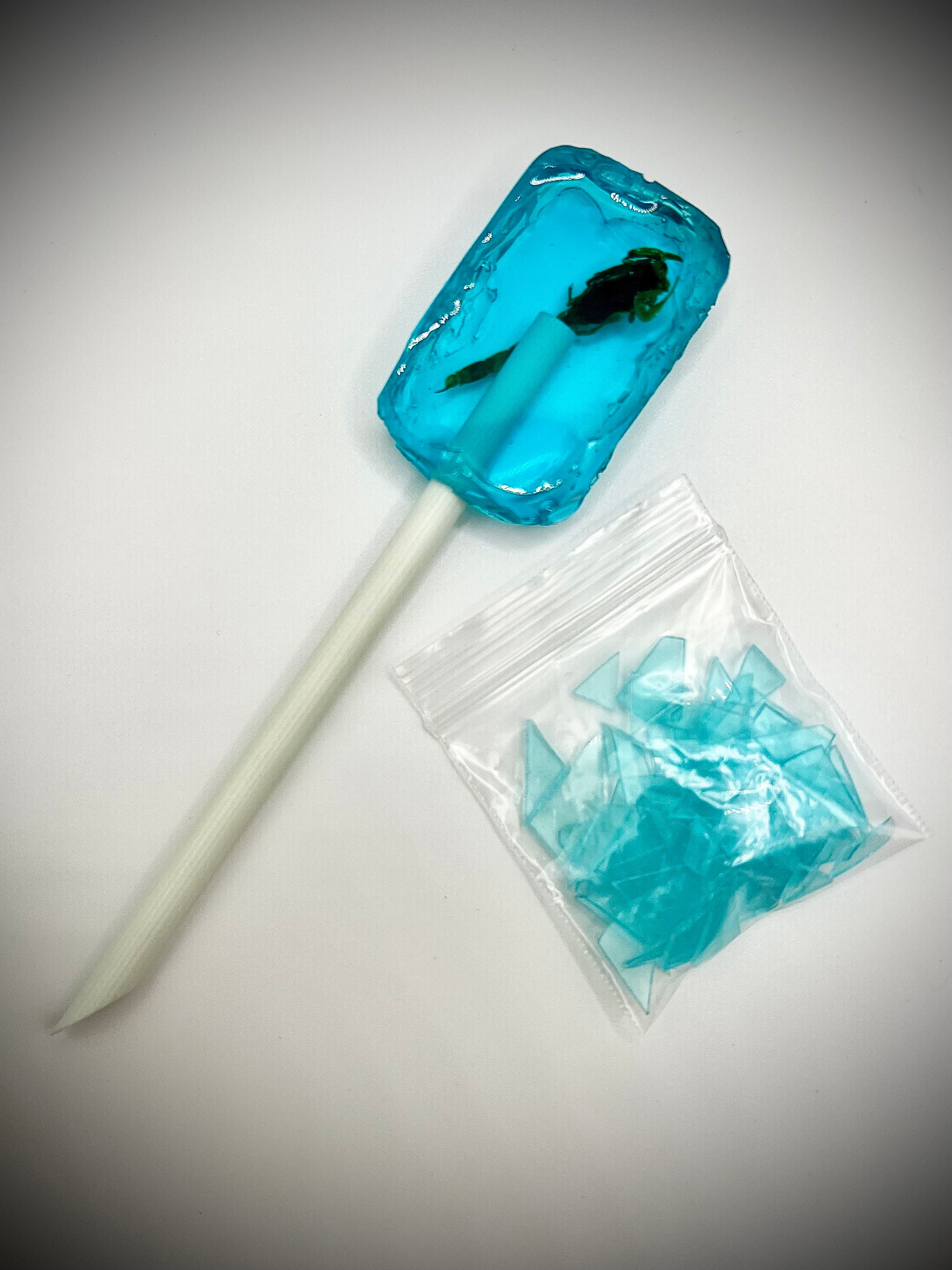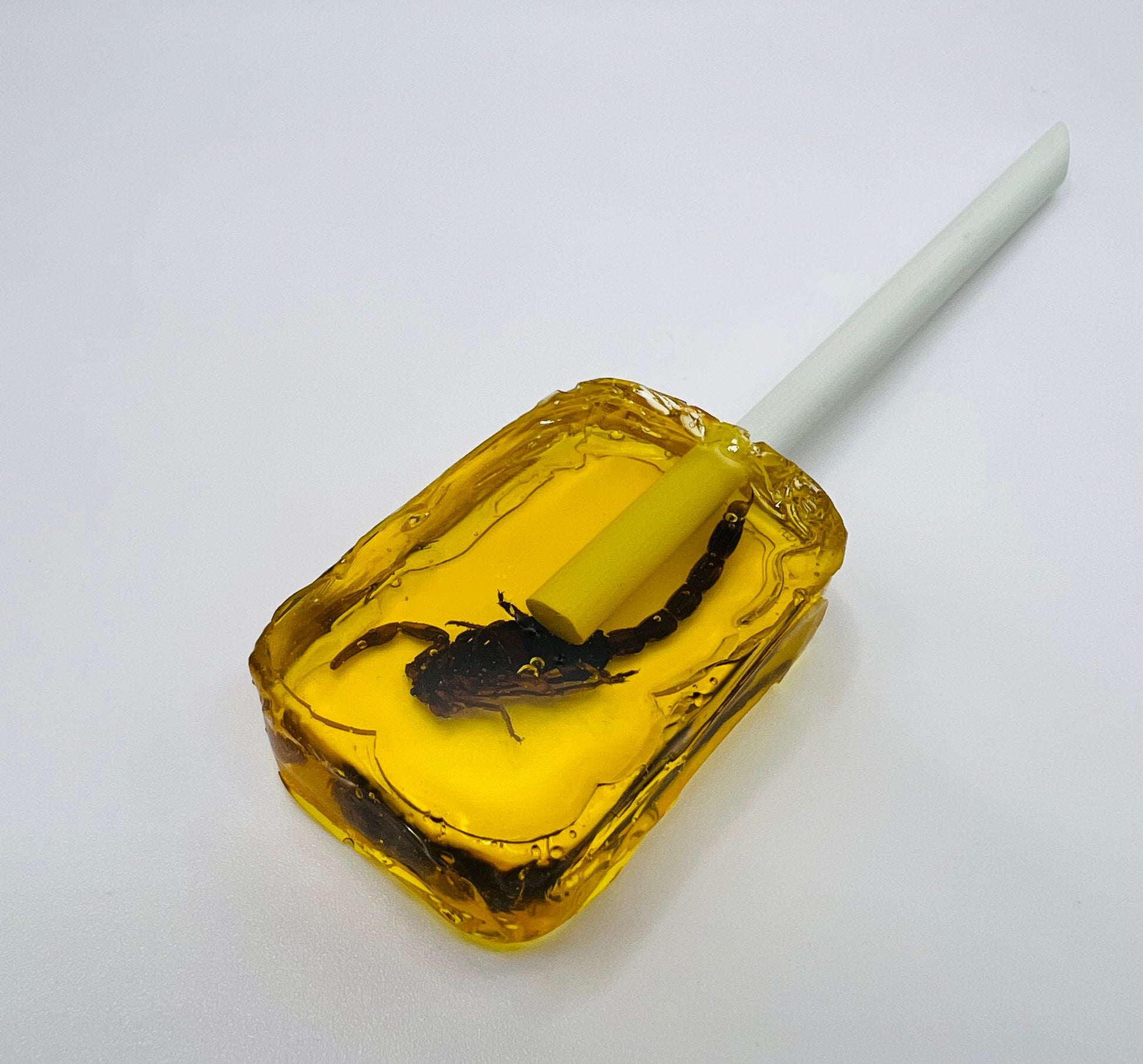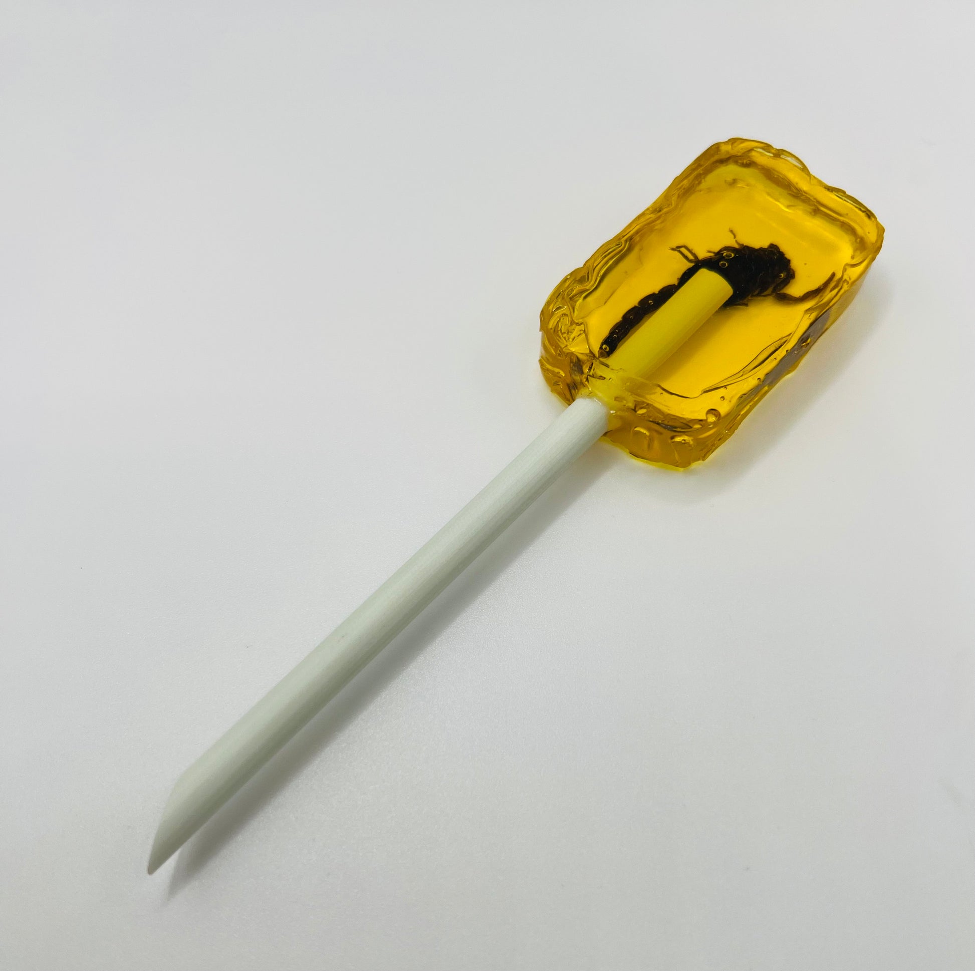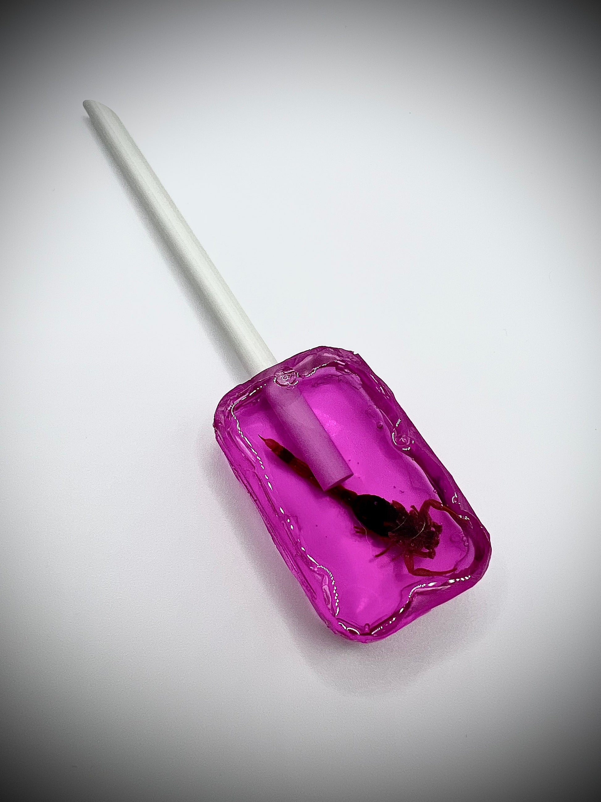 Designed as a concealable PDW, the Scorpion King consists of a high grade epoxy body with an exposed 3.5" G10 shaft and a real Manchurian scorpion inside. The design itself is molded to the exact specifications of a real scorpion lollipop. The Scorpion King is lightweight, non-porus, non-magnetic, easily concealable, and ergonomic in the hand. The beveled edge allows for aggressive use, and also re-sharpening after testing/use. Comes with a rubber end cap and is made by hand in the USA. Not made for consumption.